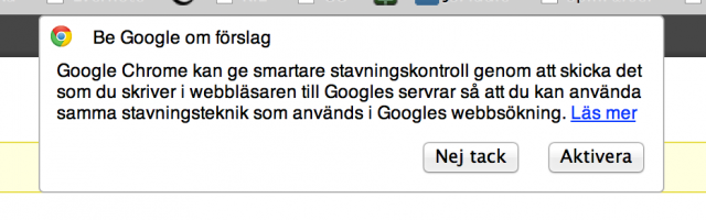 Jag blir erbjuden möjligheten att göra stavningskontroll via Google. När jag klickar in denna så får jag upp följande pop-up: