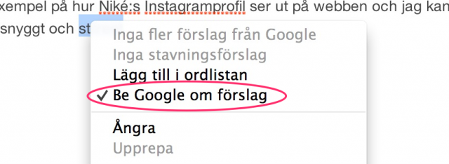 Upptäckte något nytt idag när jag satt och skrev ett inlägg här på bloggen och stavade fel vilket jag ofta göra. Ordet blev rödmarkerat med punkter under för att tillkalla min uppmärksamhet. Så jag högerklickar på ordet för att få upp förslag och då upptäcker jag något som jag inte har sett innan.